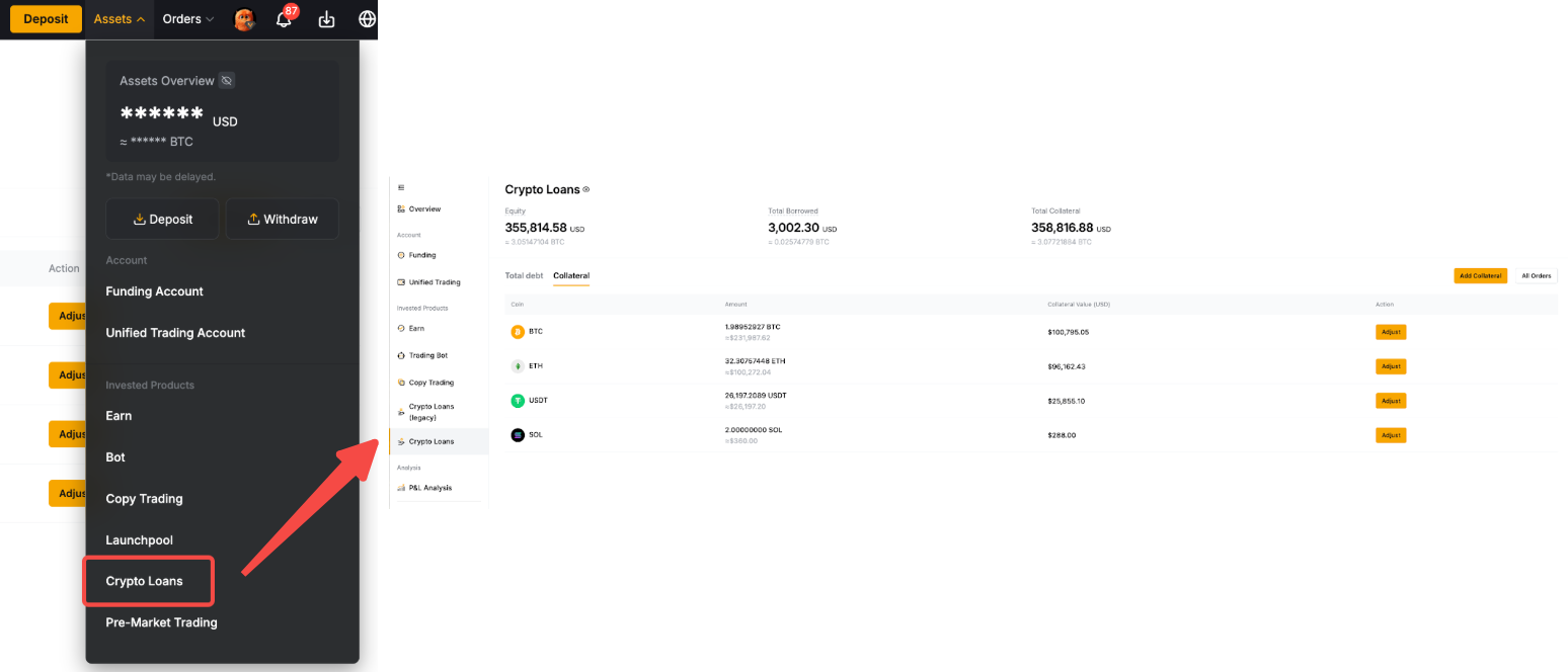 Atau, klik Aset → Pinjaman Kripto di sudut kanan atas halaman. Di bawah tab Pinjaman Kripto, klik Sesuaikan Jumlah Jaminan di kolom tempat Anda ingin menyesuaikan.