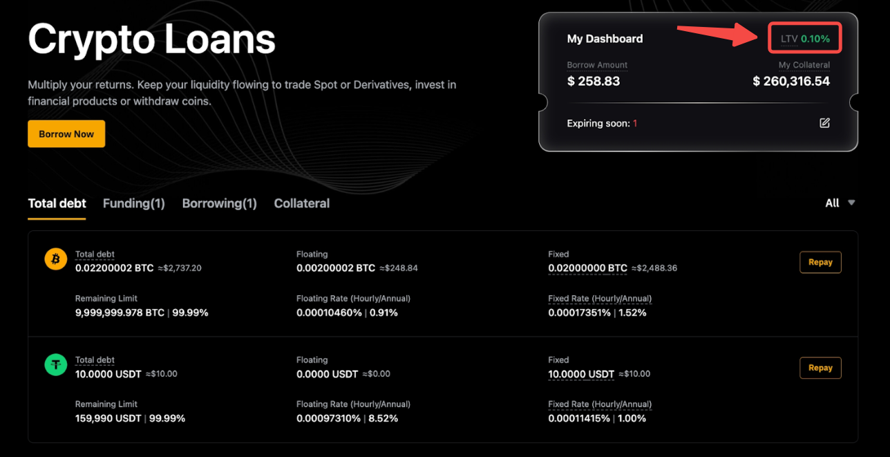 Anda dapat melihat rasio LTV di sisi kanan atas halaman Pinjaman Kripto.