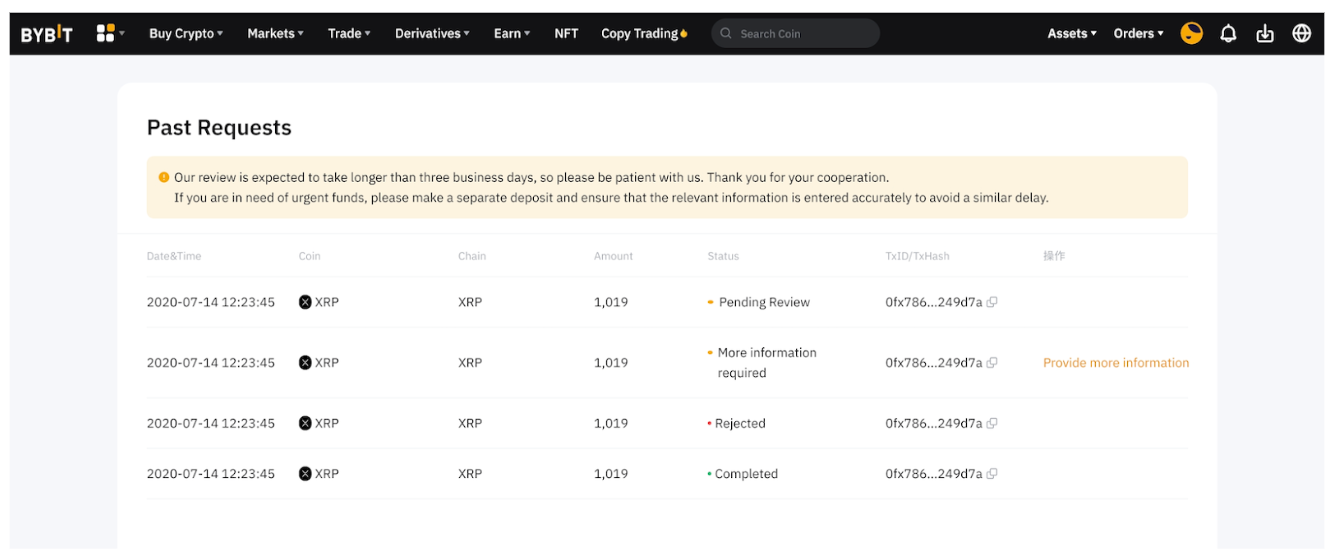 Sebelum masuk ke proses banding pengembalian dana, penting untuk memahami sifat situasi Anda. Pengembalian dana penarikan biasanya terjadi ketika trader melakukan penarikan dari Bybit ke bursa lain, tetapi bursa lain menolak deposit dan mengembalikan jumlah tersebut ke Bybit karena beberapa alasan seperti deposit tag tidak valid, atau koin yang didepositkan tidak didukung, dan masih banyak lagi.