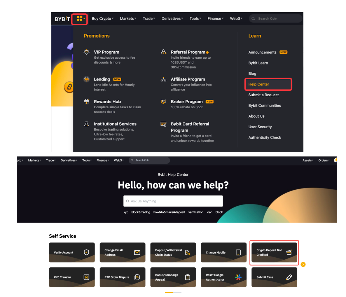 Langkah 1: Arahkan kursor ke sudut kiri atas untuk mencari Pusat Bantuan → Pilih Deposit Kripto belum dikreditkan, dan Anda akan diarahkan ke laman Layanan Mandiri.