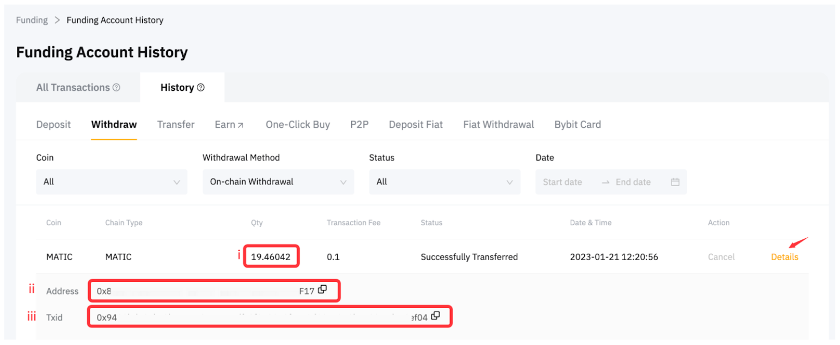 Tampilkan detail penarikan Bybit: Tunjukkan kepada kami detail penarikan Bybit yang terkait dan semua detail transfer deposit/pengembalian dana. Detail harus mencakup jumlah, jenis koin, tanggal dan waktu transfer, dan TXID (hash Transaksi) yang telah diselesaikan.