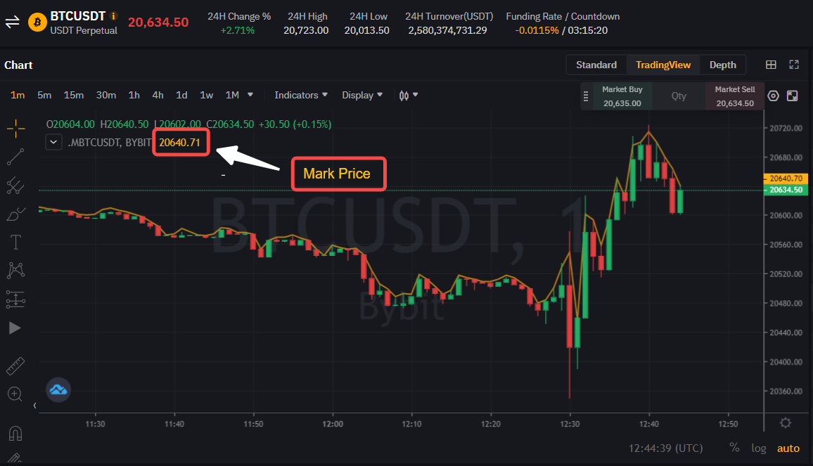 Pada asalnya, harga yang tertera pada grafik Bybit adalah riwayat harga dan pergerakan dari Harga Terakhir Diperdagangkan (Last Traded Price/LTP) platform. Sebaliknya, likuidasi dipicu oleh Harga Penanda (angka harga kuning di buku pesanan) dan bukan LTP (harga yang Anda lihat di grafik LTP, angka harga pada sisi kiri buku pesanan) dikarenakan Bybit mengadopsi Mekanisme Harga Ganda. Mesin likuidasi akan mengambil alih proses likuidasi dari posisi Anda hanya pada saat harga Penanda mencapai harga likuidasi dari posisi Anda.