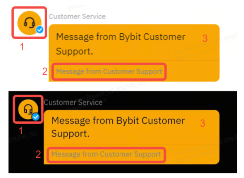 Bybitカスタマーサポートからのメッセージはすべて、ヘッドホンアイコンで、右下に正式な青色のチェックマークが表示されます。 |