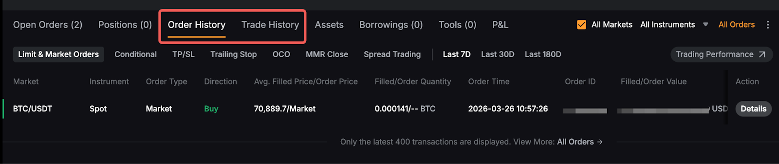 You can switch to the Order History or Trade History tab on the Spot Trading page to view up to 400 records from the last six (6) months. Similar to Current Orders, you can check the All Markets box to view order history or trade history from all trading pairs and select Spot Only in the Instruments menu to only see Past Spot orders and trades.