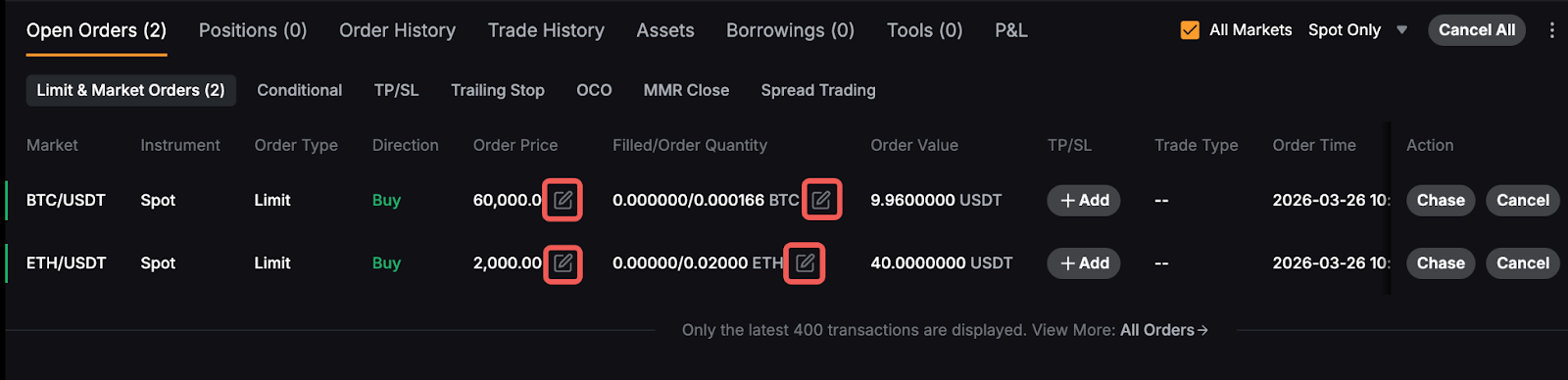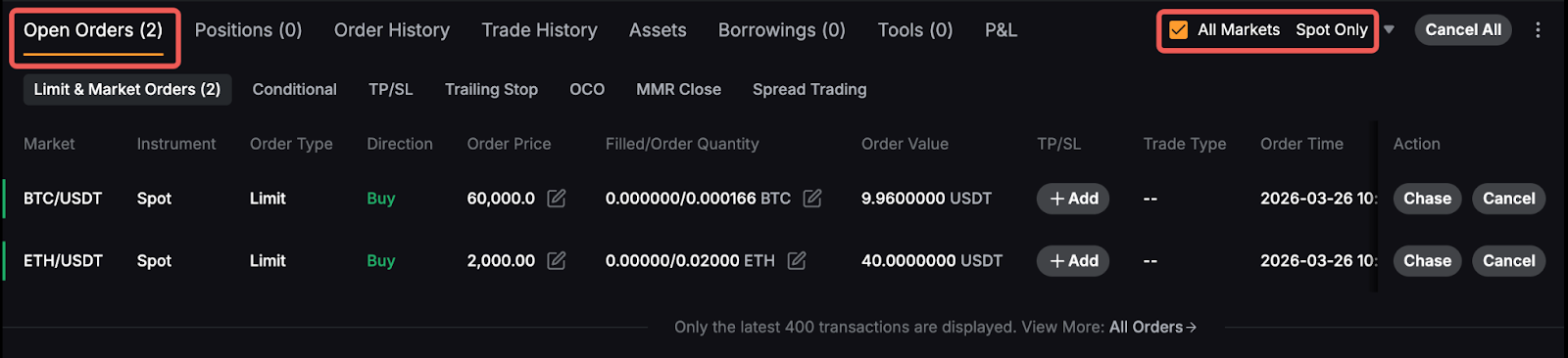 You can view your current unfilled or untriggered orders on the Open Orders tab. To show all current orders across all trading pairs in all available products, you can check the All Markets box. If you want to limit the selection to Spot Trading pairs, simply select Spot Only in the Instruments menu.