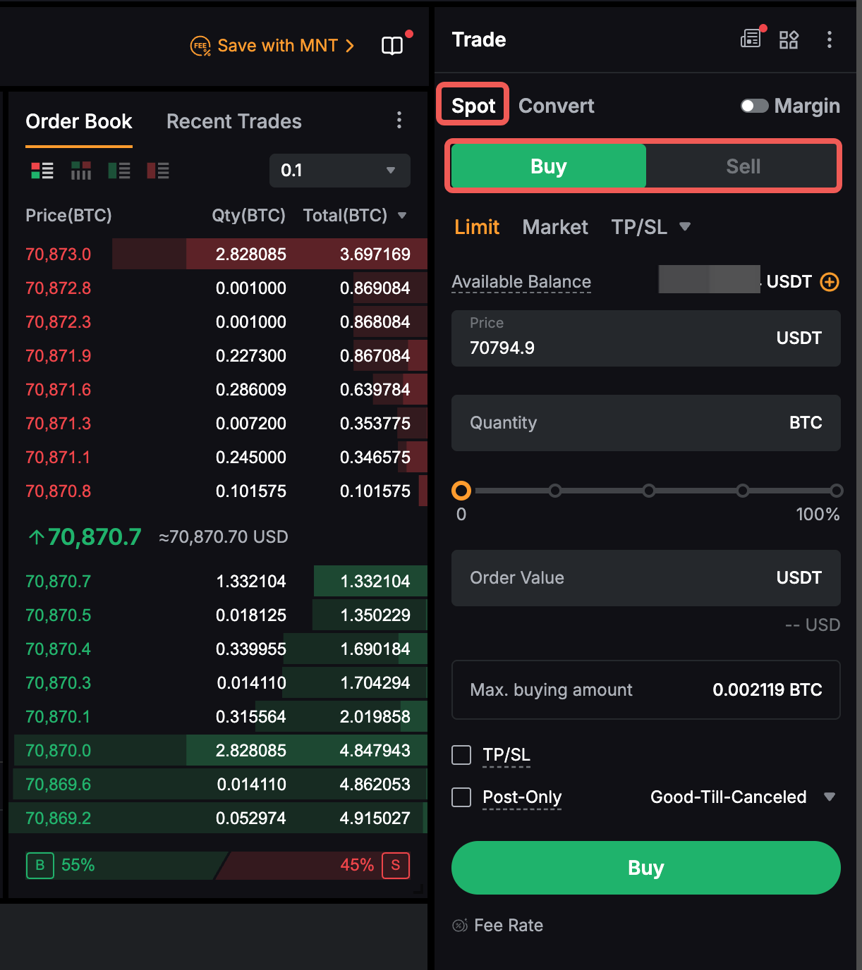 Note: When you select 100% of your available balance to place a market buy or market sell order, there may be a slight difference between the maximum amount or quantity displayed and the value or quantity calculated by our system. This difference acts as a buffer against potential market price changes, ensuring that your order will be placed smoothly even if the price fluctuates slightly.