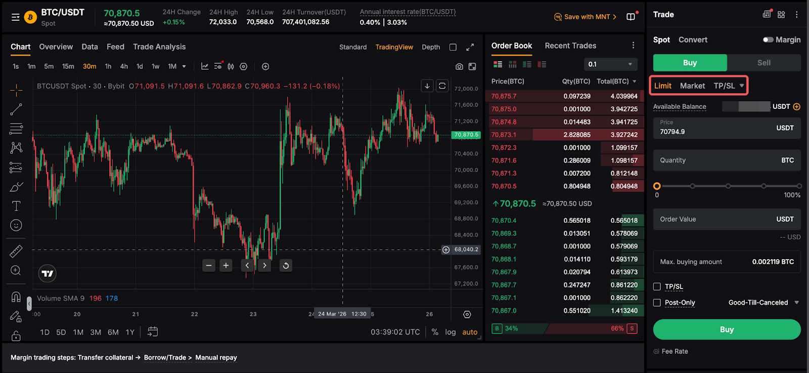 Bybit Spot Trading provides you with various order types. To learn more about the differences between each order type, please refer to Types of Orders Available on Bybit.