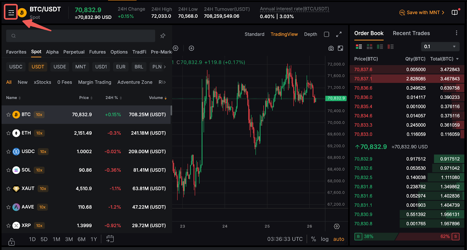 On the left side of the page, hover your cursor on the dropdown beside the trading pair, and you will see all supported Spot trading pairs, along with the Last Traded Price and the 24-hour change percentage of the corresponding trading pair.