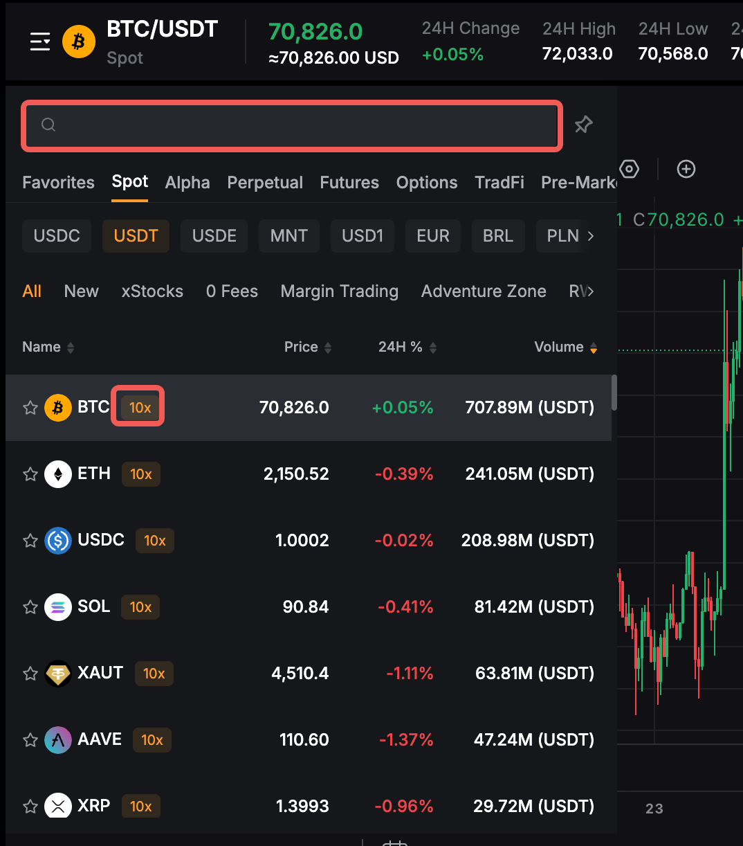 To quickly find the trading pair you desire, please use the search box to directly enter the trading pair you want to view. If you see a 10x label beside a certain trading pair, it indicates that the trading pair is supported in Spot Margin Trading.
