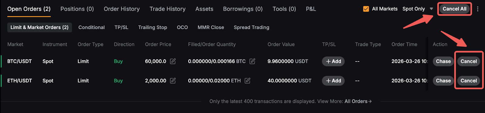 To cancel Spot orders, navigate to the Current Orders tab and click on Cancel. Alternatively, you can choose to Cancel All orders from the upper right corner. It's important to note that if you have selected the All Markets option, clicking on Cancel All will cancel orders from all trading pairs.