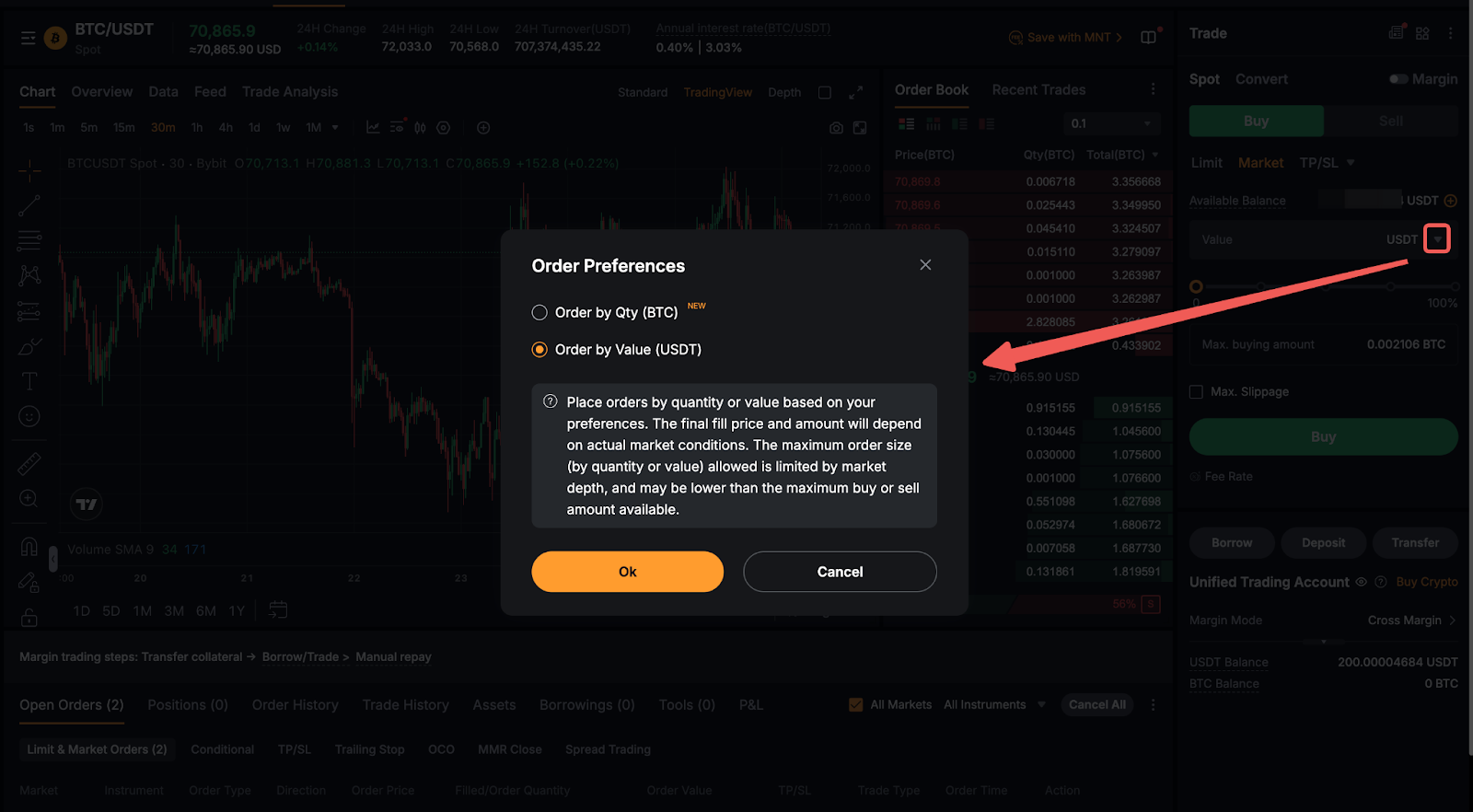 For market buy and sell orders, the default is to place an order by value (market buy) and by quantity (market sell). You can click on Order by Value or Order by Qty to switch your order placement preferences.