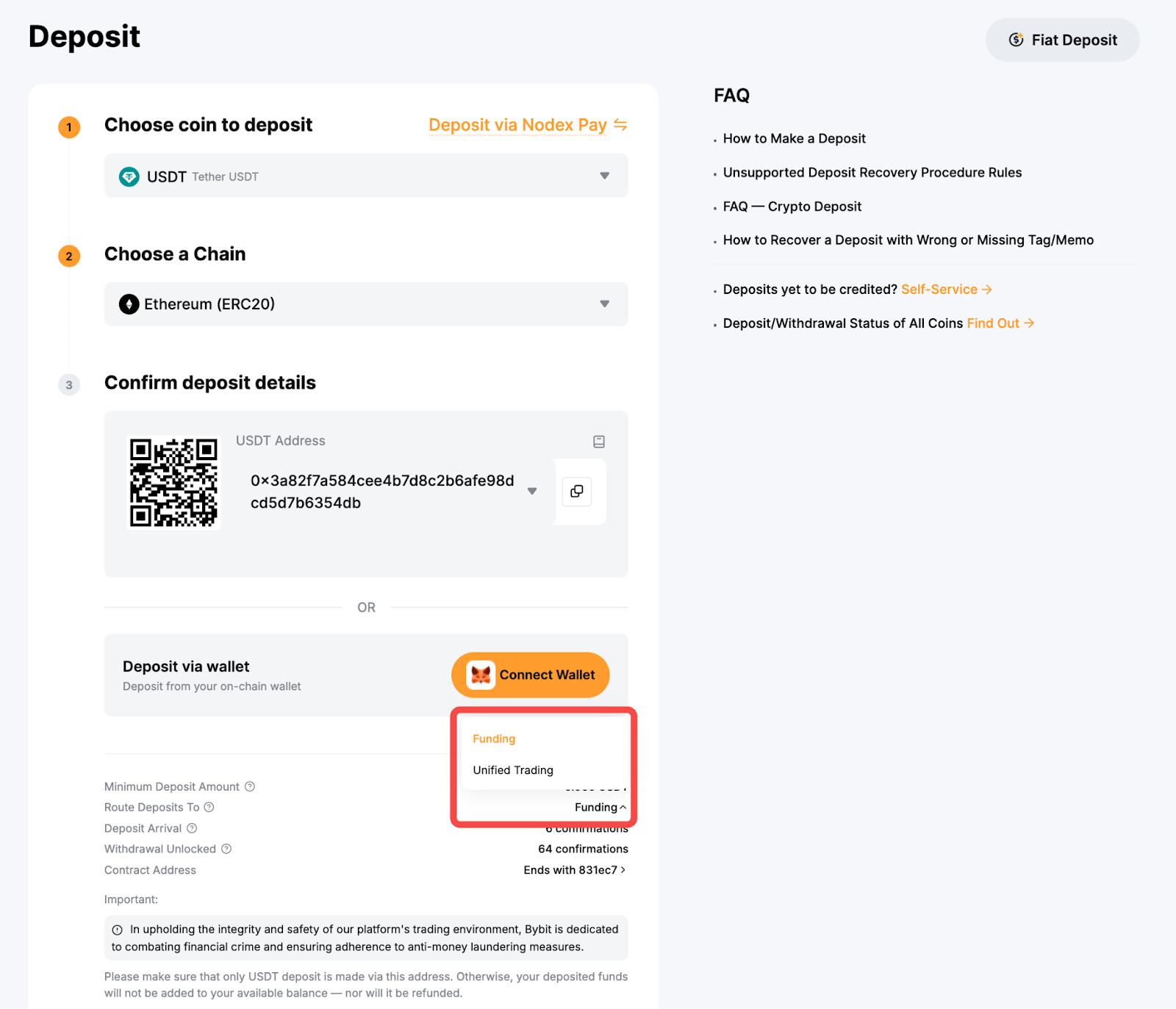 The default setting is the Funding Account. However, you may change the deposit destination to your Unified Trading or Earn Account on the Deposit page or Settings page.