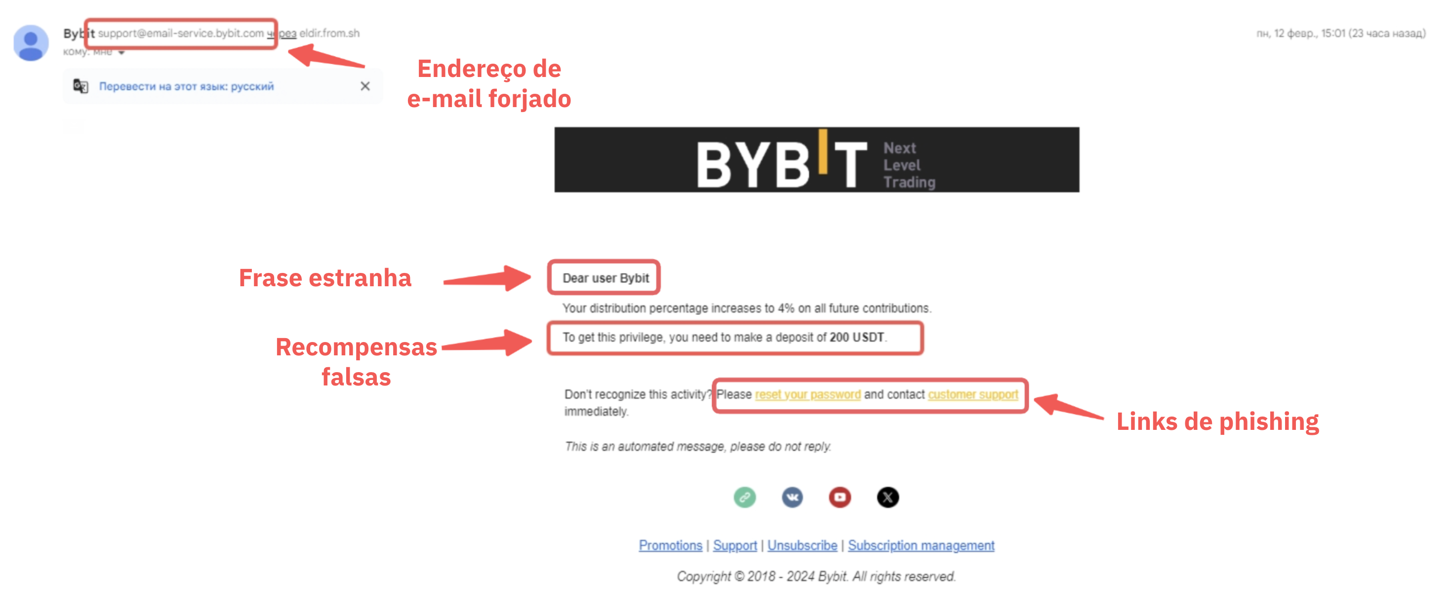 Verifique as informações de contato do remetente (por exemplo, endereço de e-mail, número de telefone, URLs de sites, etc.) em relação aos canais oficiais legítimos conhecidos do Bybit procurando por inconsistências ou elementos suspeitos.