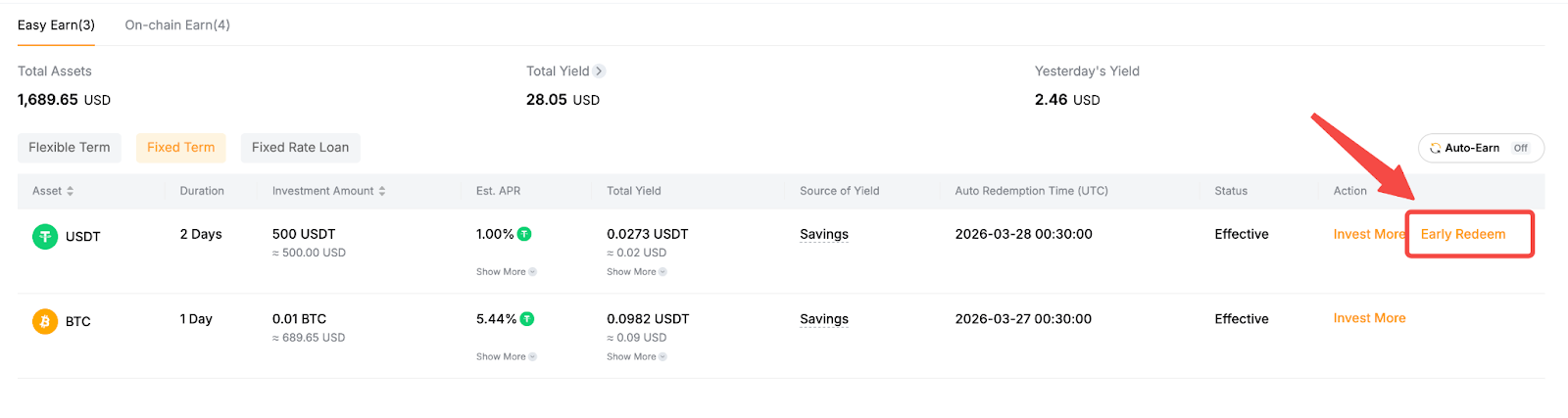 Você pode reinvestir automaticamente o rendimento recebido ativando a opção Auto Earn. Nesse caso, ele não será tratado como uma nova ordem, seu rendimento será combinado com seus ativos investidos existentes para gerar rendimento adicional. Observe que o valor total do investimento não deve exceder o limite máximo.