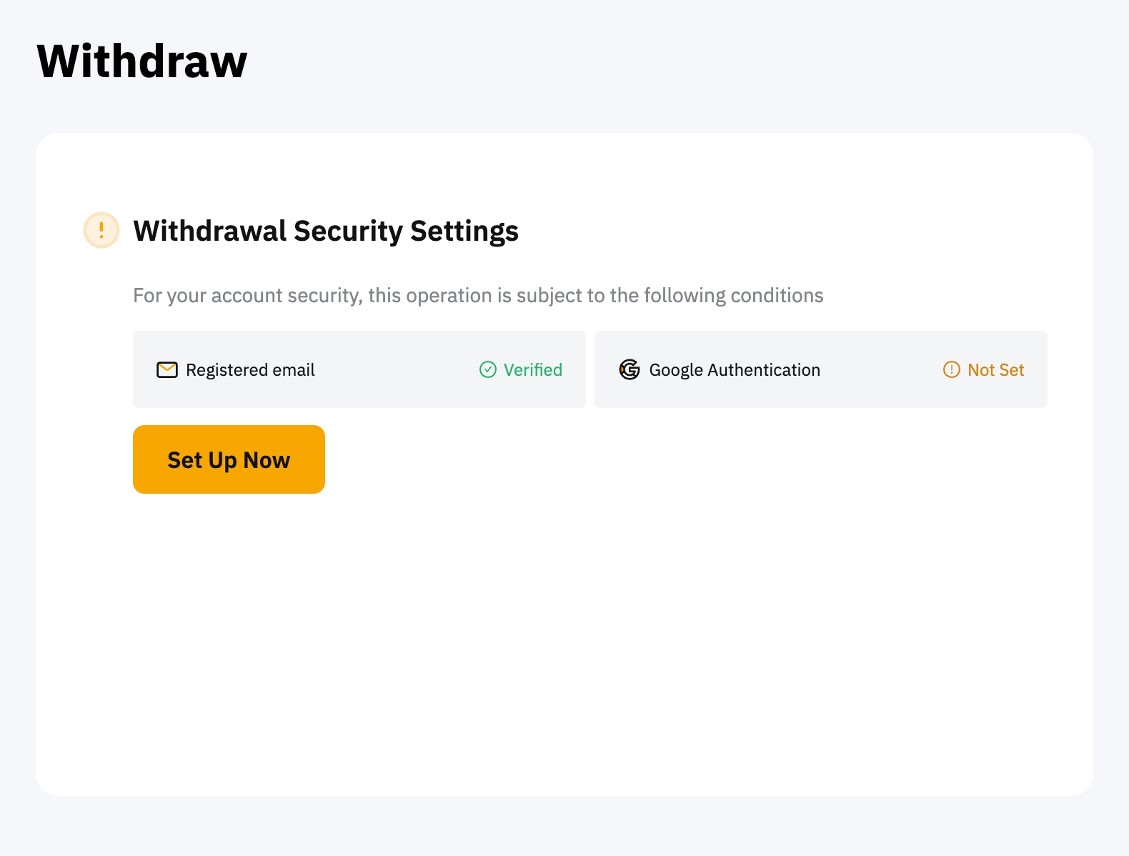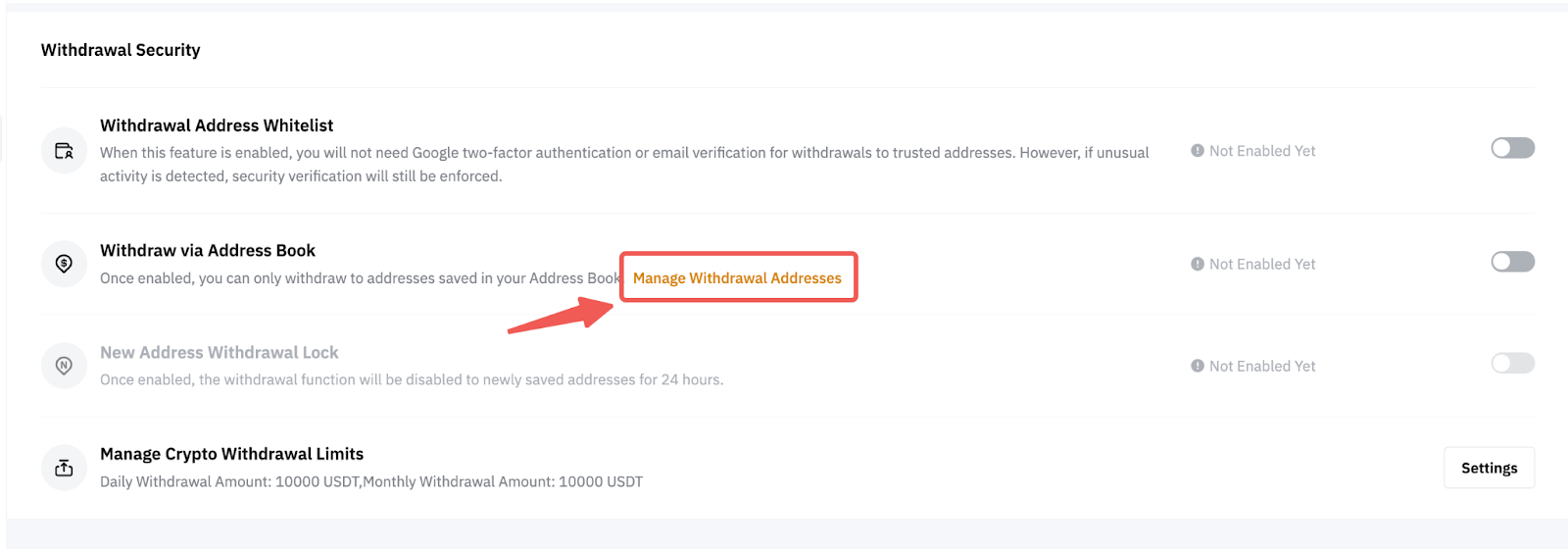 Você pode acessar e modificar suas configurações de saque na página Gerenciamento de carteiras clicando no botão Configurar. Você será redirecionado para as funções de segurança de saque na página Conta, onde poderá alternar as opções que deseja ativar ou desativar.