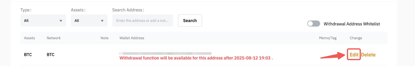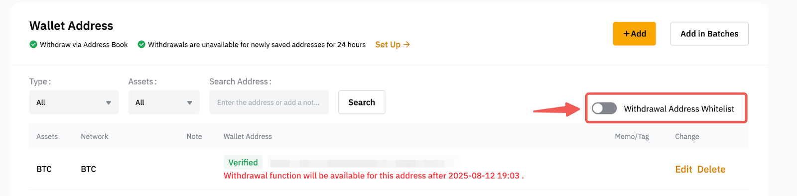 Assim que o endereço de saque for verificado, você poderá colocar o endereço na lista de permissões alternando a opção de lista de permissões de endereço de saque. Isso permitirá que você faça um saque sem precisar concluir o e-mail e o processo de verificação de segurança 2FA.