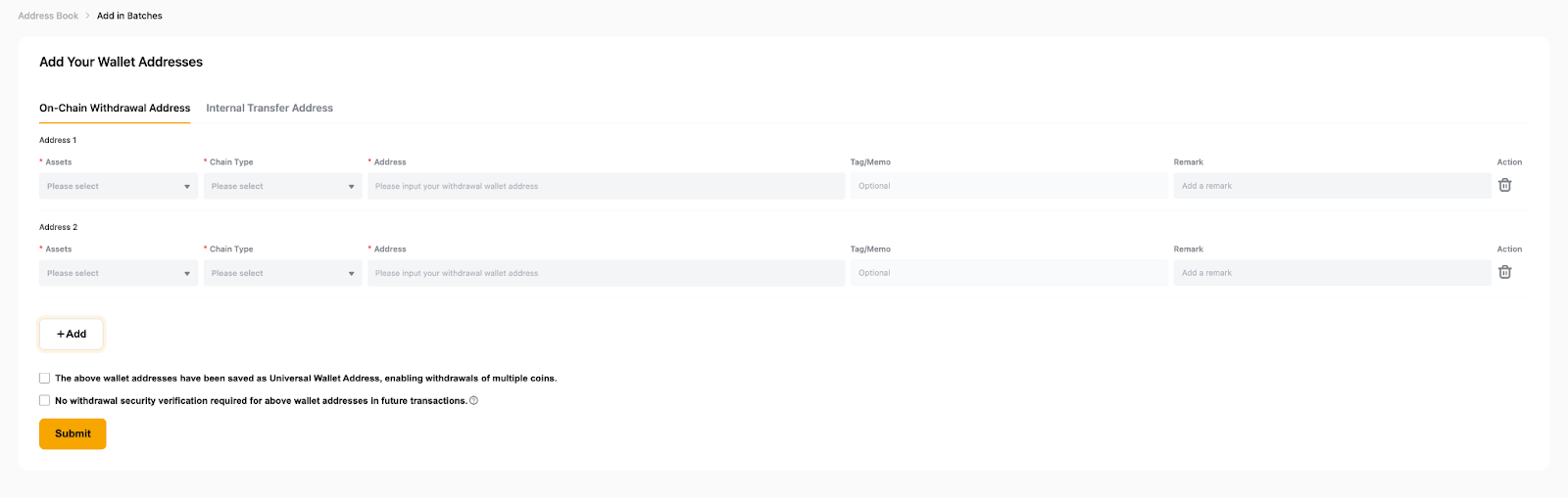 Se você quiser adicionar endereços de carteira em lotes para endereço de saques na rede/chain e endereços de transferência interna, observe o seguinte: