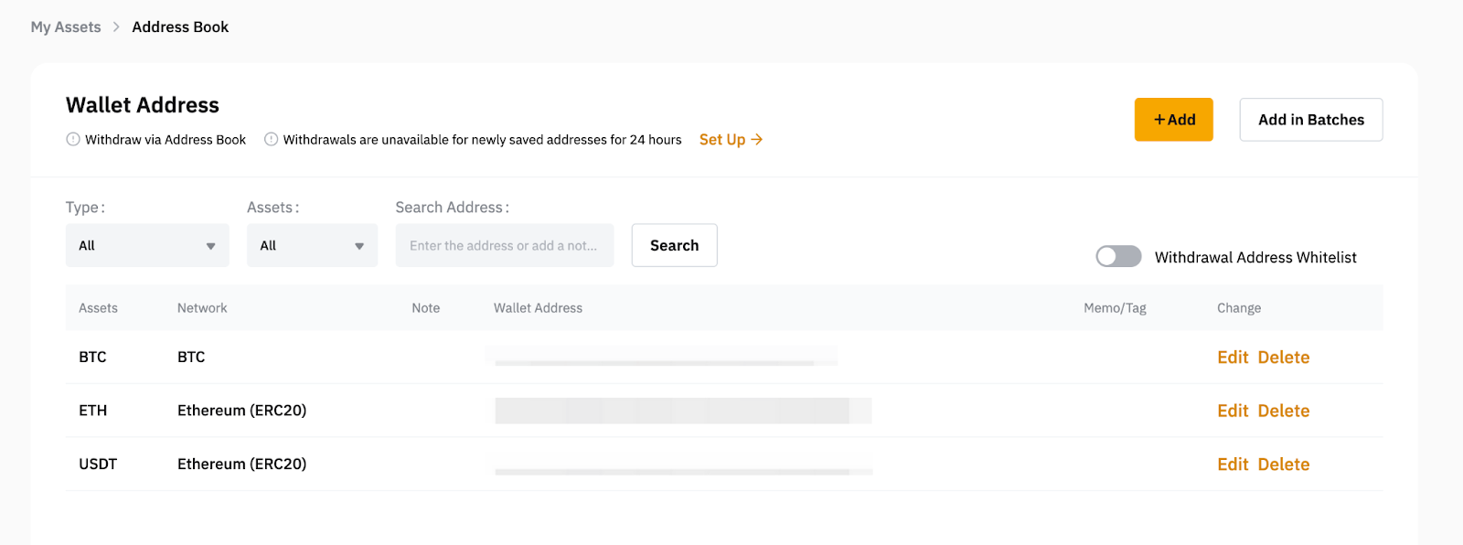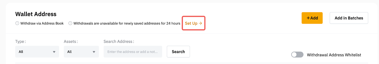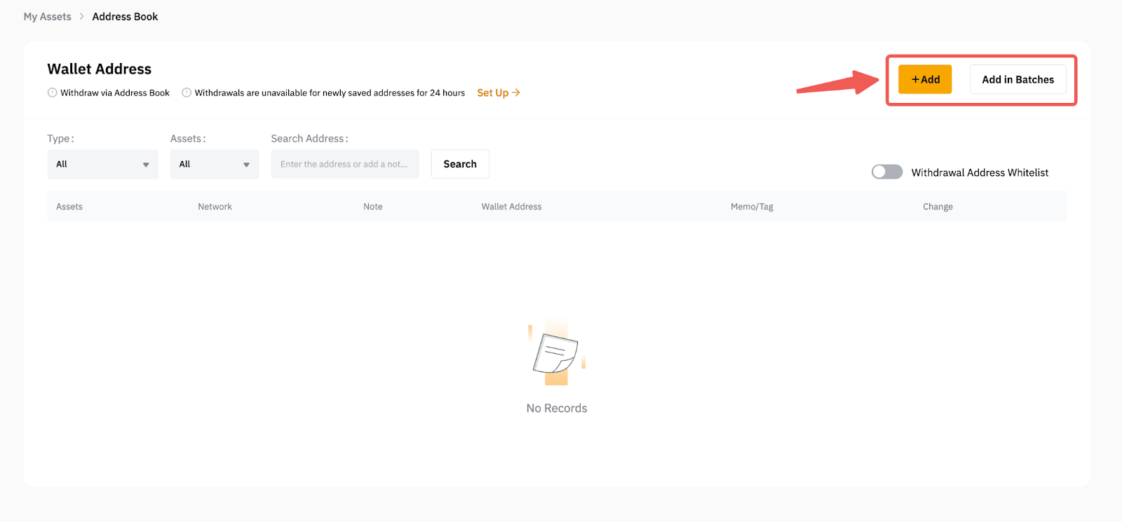 a. Depois de acessar a página Gerenciamento de carteiras, clique no botão Adicionar no canto superior direito da página para adicionar um novo endereço de carteira. Se quiser adicionar vários endereços ao mesmo tempo, clique em Adicionar em lotes.