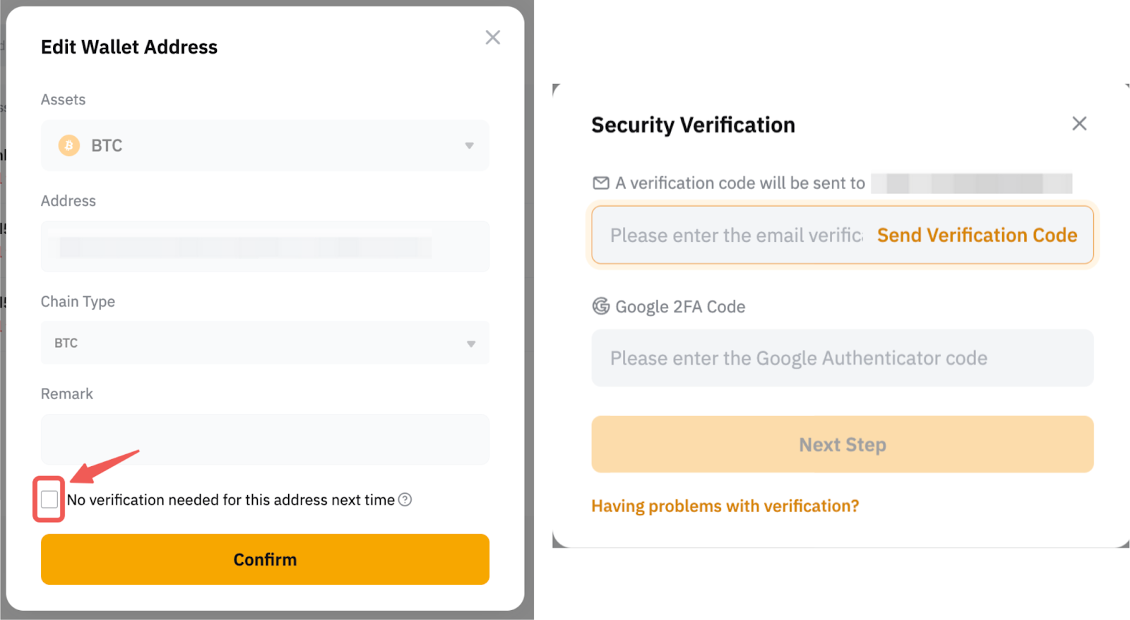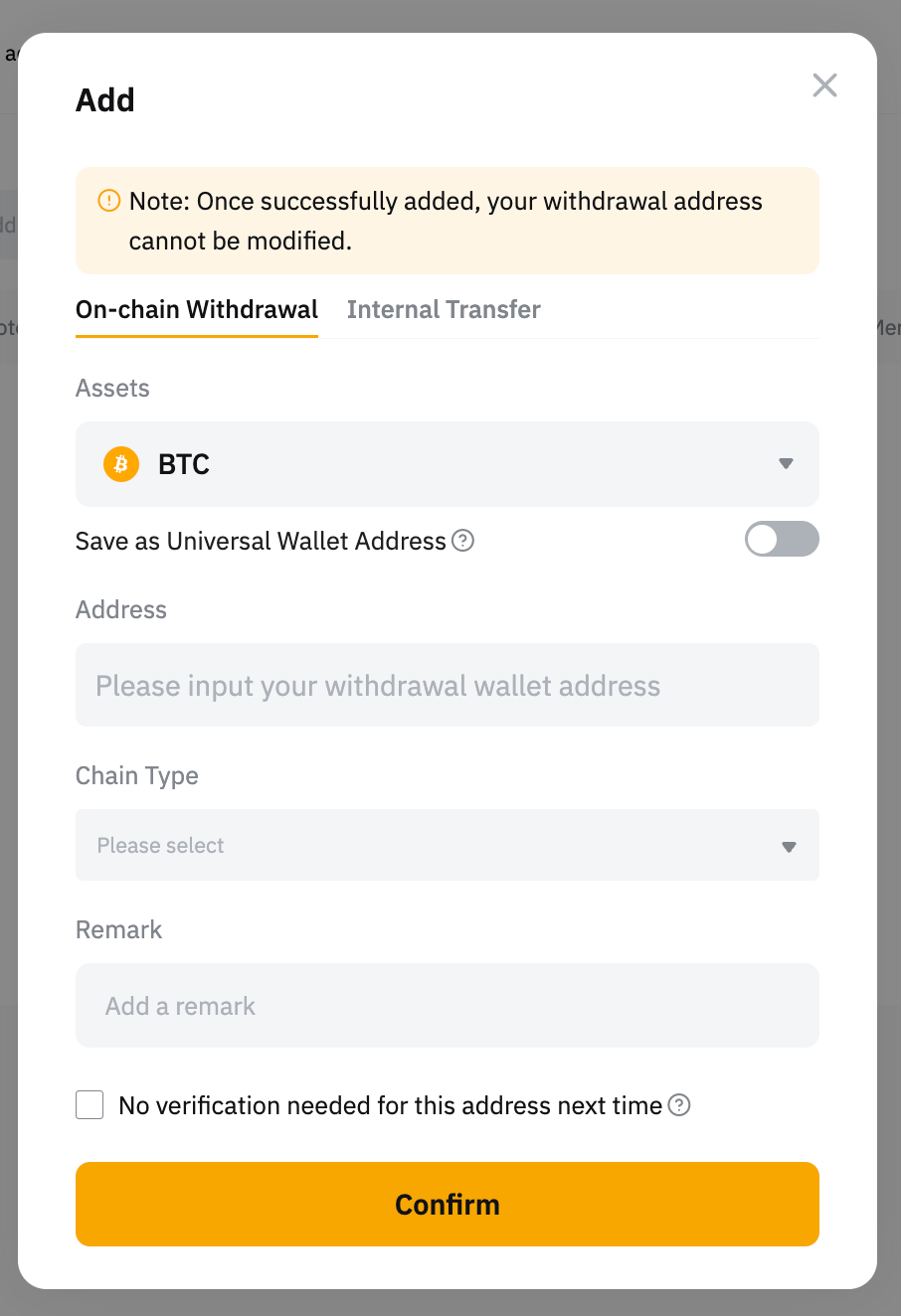 3. Marque a caixa abaixo se desejar habilitar a função Salvar como endereço de carteira universal ou Não é necessária verificação para este endereço da próxima vez. No entanto, observe que a verificação de segurança também pode ser necessária se houver alguma atividade incomum detectada em sua conta.