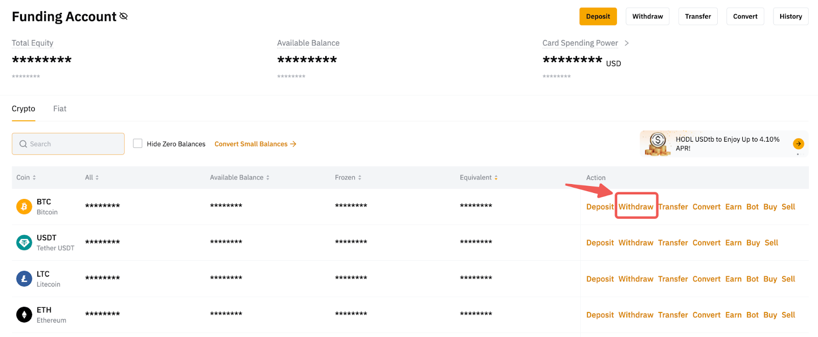 Como alternativa, você também pode clicar em Ativos no canto superior direito da página inicial e ir para sua Conta de Fundos. Em seguida, clique em Sacar na coluna da moeda para a qual deseja adicionar o endereço da carteira.