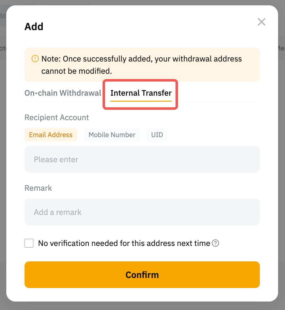 Se você quiser adicionar uma conta de transferência interna, basta inserir seu endereço de e-mail, número de celular ou UID da conta Bybit à qual gostaria de sacar.