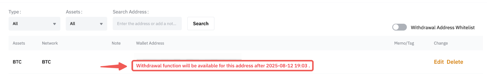Se você ativou o recurso de segurança Bloqueio de saque de novo endereço, por exemplo, a função de saque ficará restrita por 24 horas para o endereço recém-salvo ou quando você desativar o recurso de segurança.