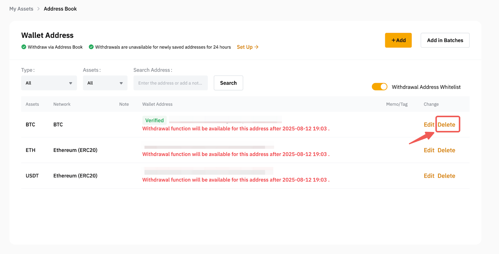 5. Excluir seus endereços de saque