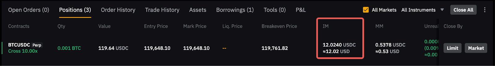Observe que a margem inicial mostrada na aba da posição inclui a taxa de taker, que pode ser incorrida no fechamento da posição.