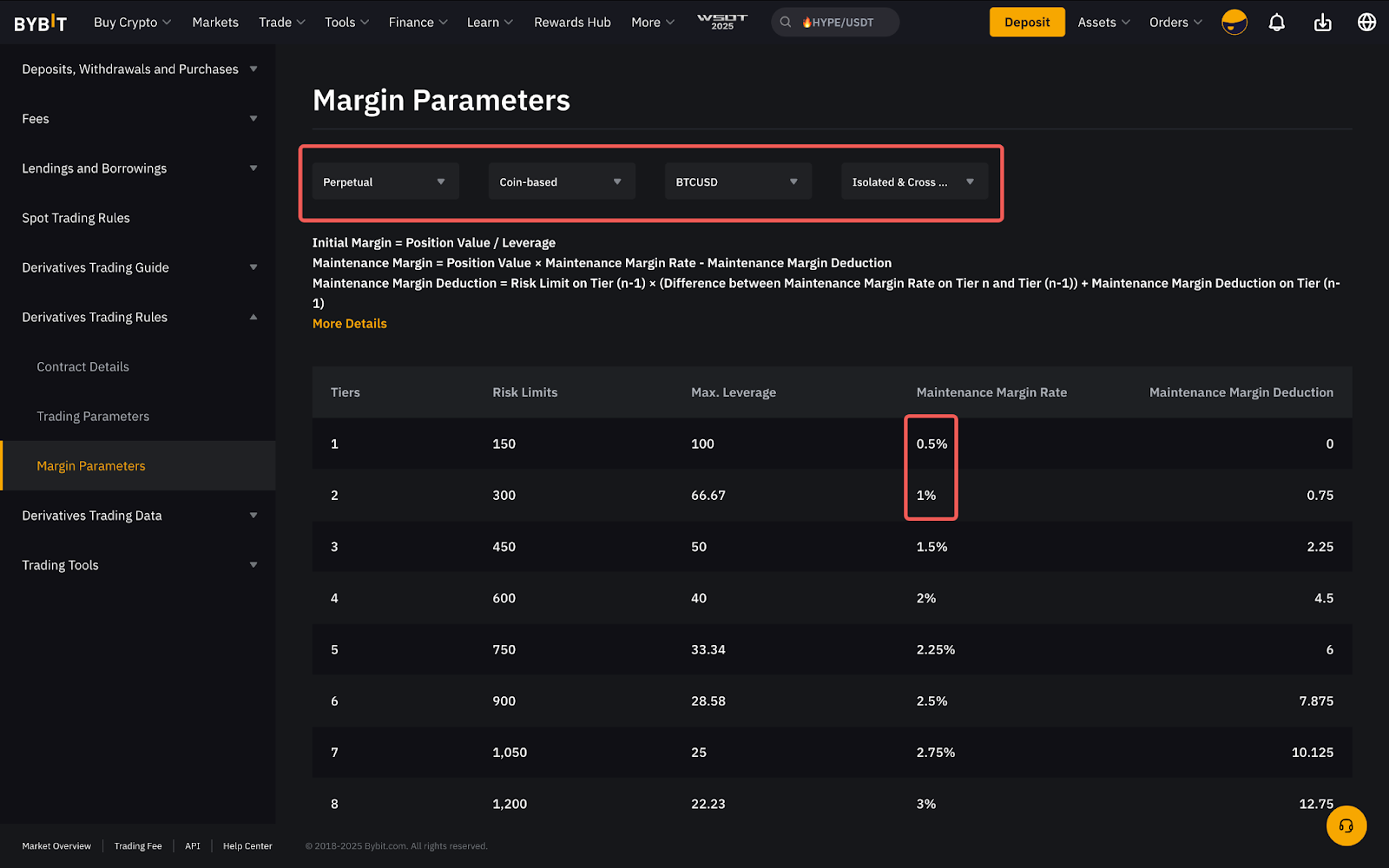 A MMR necessária para cada nível de limite de risco e o valor da dedução da margem de manutenção podem ser facilmente encontrados na página Parâmetros de margem.