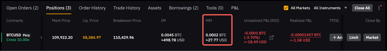 Por exemplo, quando você abre uma posição de BTCUSD com um valor de posição de 150 BTC ou menos, a taxa de margem de manutenção (MMR) necessária para a posição é de 0,5% do valor da posição. Se o valor da posição aumentar para 300 BTC, a MMR necessária também aumentará para 1% do valor da posição.