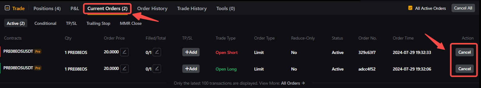 2. Отмена ордера в премаркет-торговле бессрочными контрактами