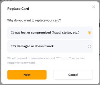 当您的 Bybit 实体卡仍在手中,但卡损坏或损坏时,请选择此选项。确认后,我们将向您的收货地址发放新的 Bybit 实体卡。收到并激活新卡后,旧卡将自动终止。