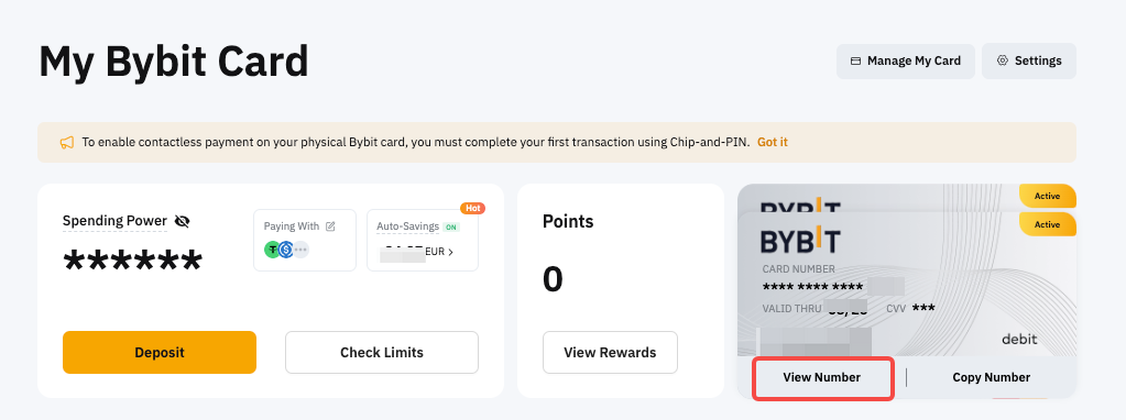 欲在网站上查看您的 Bybit Card 详情,请前往我的 Bybit Card 页面,然后点击查看卡号。 如果您有多张 Bybit Card,只需点击卡片即可切换卡片。