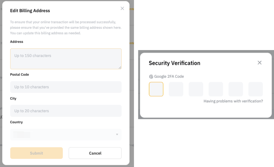 第 3 步: 填写您更新后的账单地址,然后点击提交并输入 Google 验证码以确认您的操作。