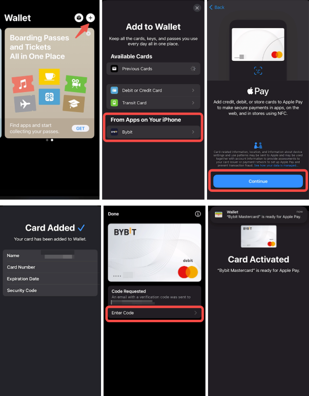 要将 Bybit Card 添加到 Apple Pay,只需在 iOS 设备上找到钱包/手表,然后点击添加卡按钮即可。然后,按照说明添加您的 Bybit Card 详情并完成安全认证。