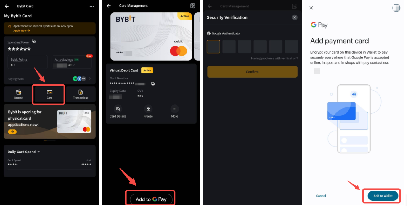 在执行此操作之前,请确保您位于 Google Pay 支持的国家或地区。只需打开 Bybit App,在 Bybit Card 页面上点击 卡 → 添加到 Google Pay ,完成安全认证,然后按照 Google Pay App 上的说明操作即可。