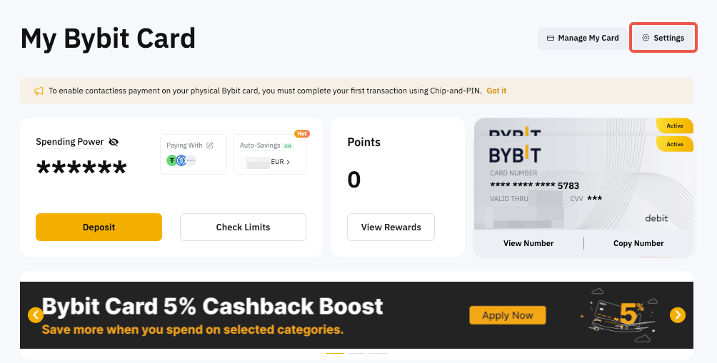 第 1 步: 前往我的 Bybit Card 页面,点击设置。