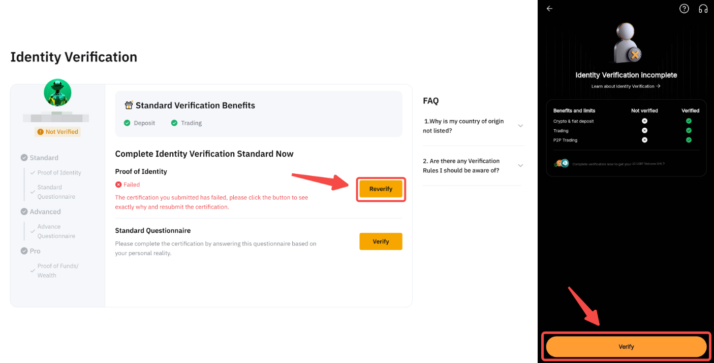 在您下次尝试之前,请仔细阅读我们的要求并准备相关证明文件。 准备好您的设备和相机,并确保您处于明亮的环境中。一切就绪后,点击【认证】重新进行 KYC 认证。