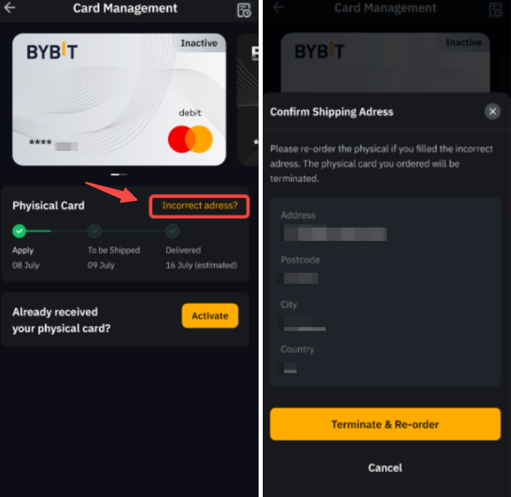 申请通过并付款后,我能否更改 Bybit 实体卡的收货地址?