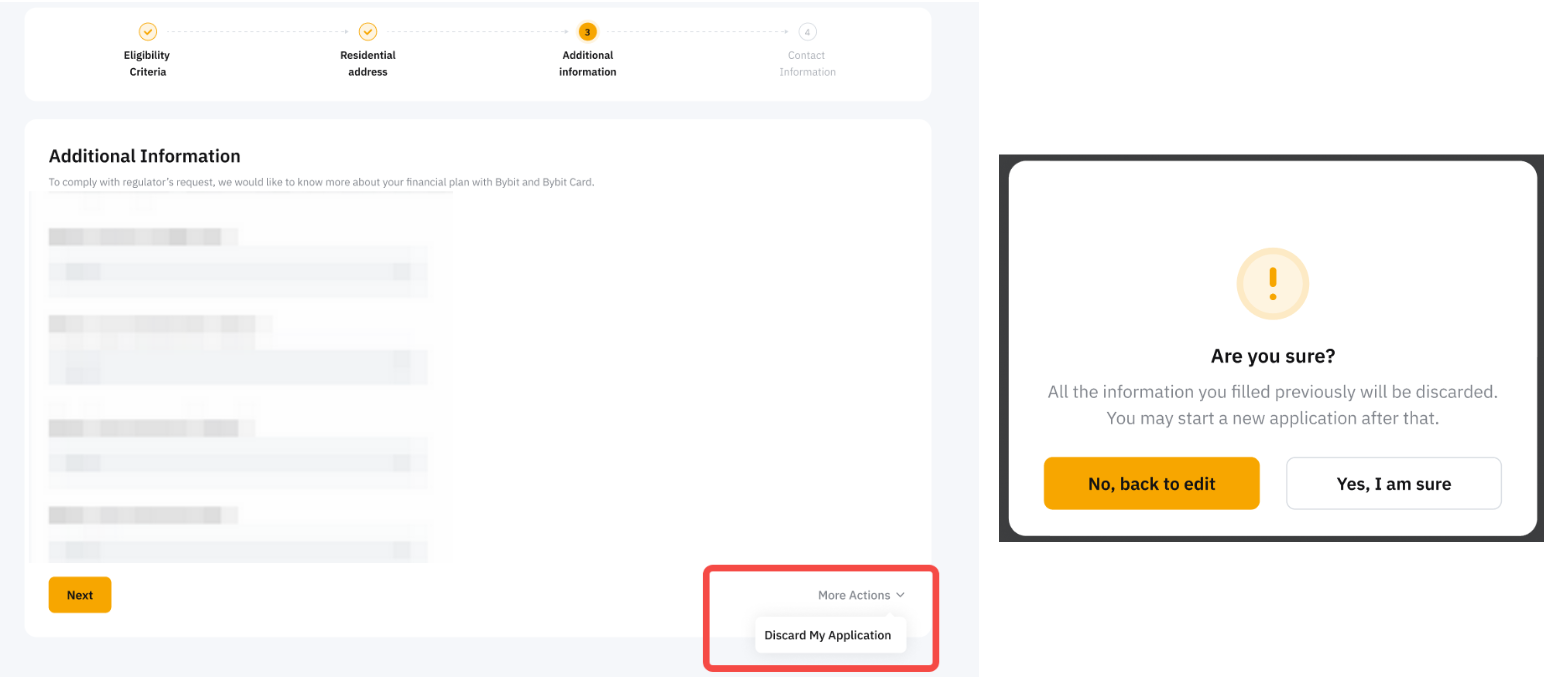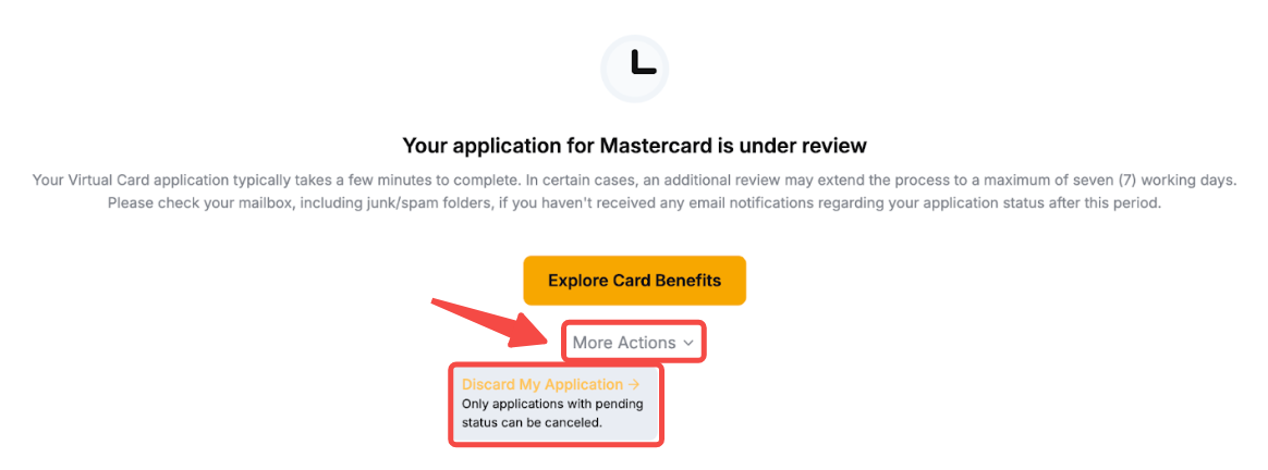 您可以通过单击查看我的申请 → 更多并选择取消我的卡片申请来取消您的 Bybit 卡申请。