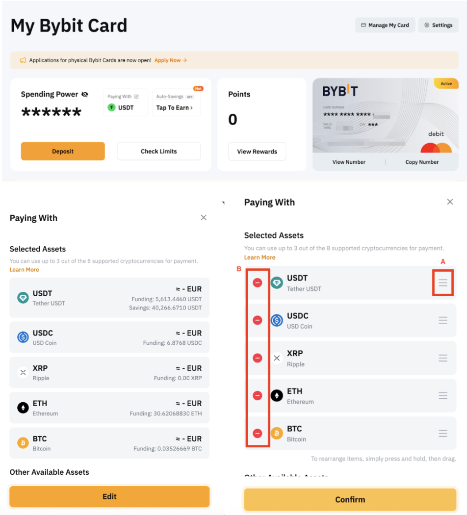 您最多可以为 Bybit 卡交易选择 6 种支付加密货币,默认支付优先级为 USDT > USDC > TON > BTC > ETH > XRP。但是,您可以在卡管理页面上管理您的消费货币,包括添加、删除或更改顺序。