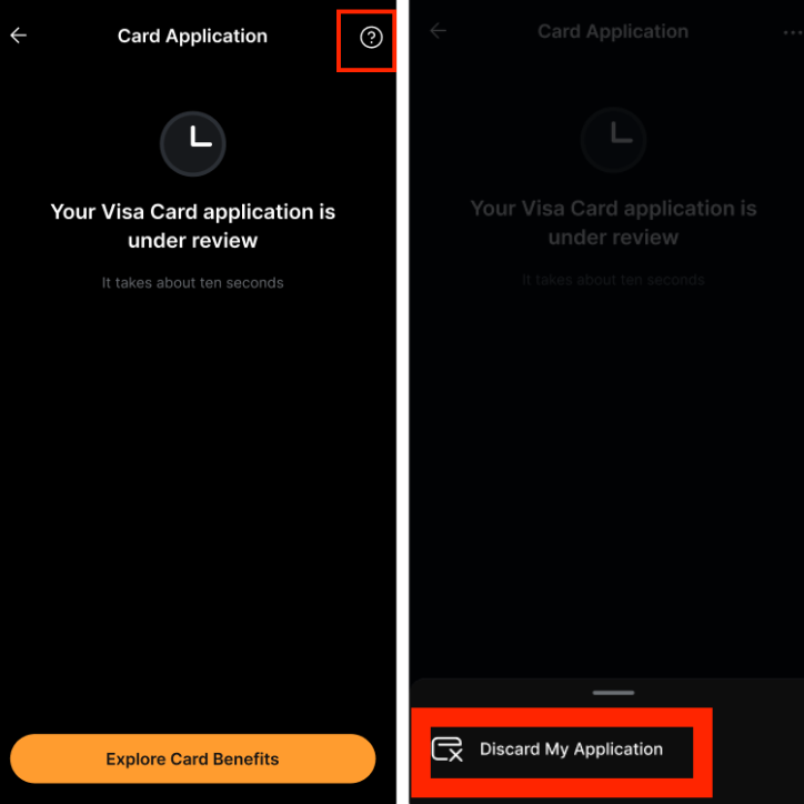 在应用程序上,您可以单击查看我的申请,然后单击 “?” 按钮。然后选择取消我的卡片申请。