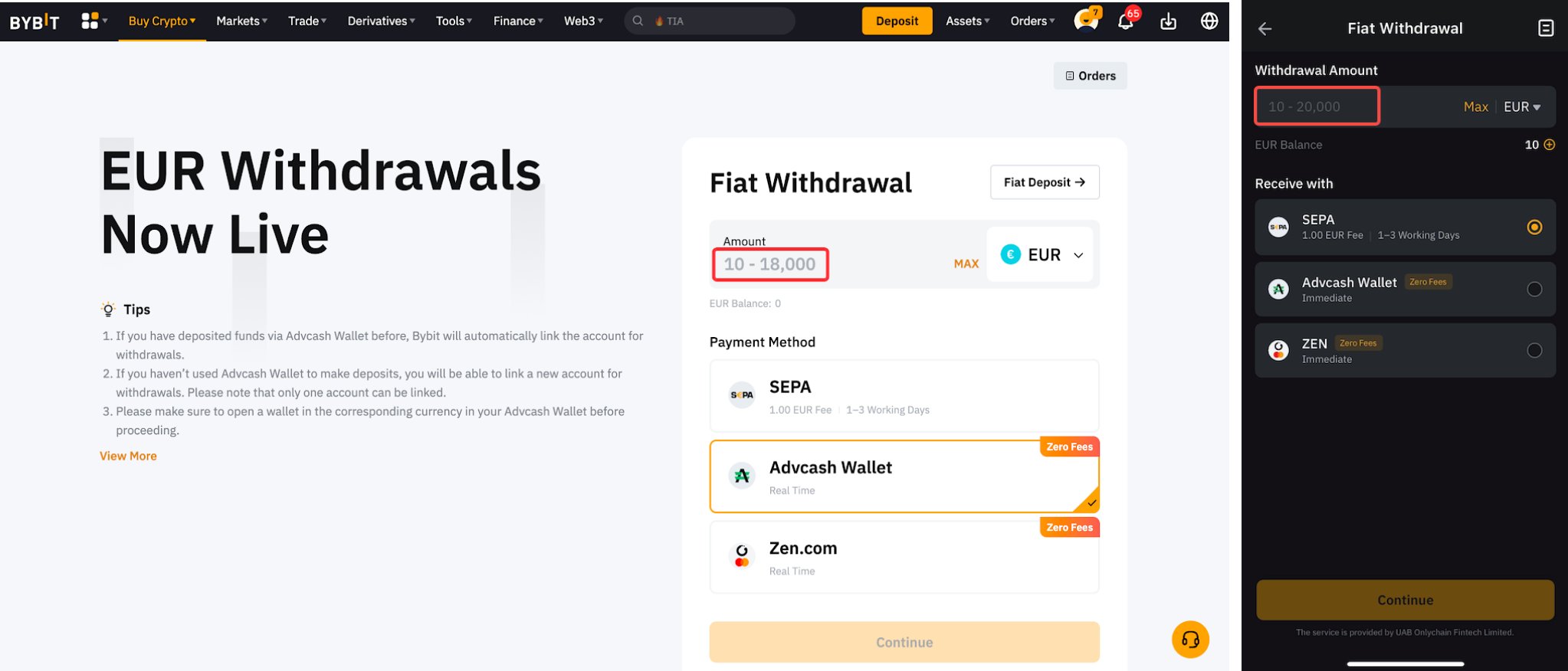 Bybit 仅支持一定种类的法币提币。您可以在法币提币页面查看法币提币支持的法币。