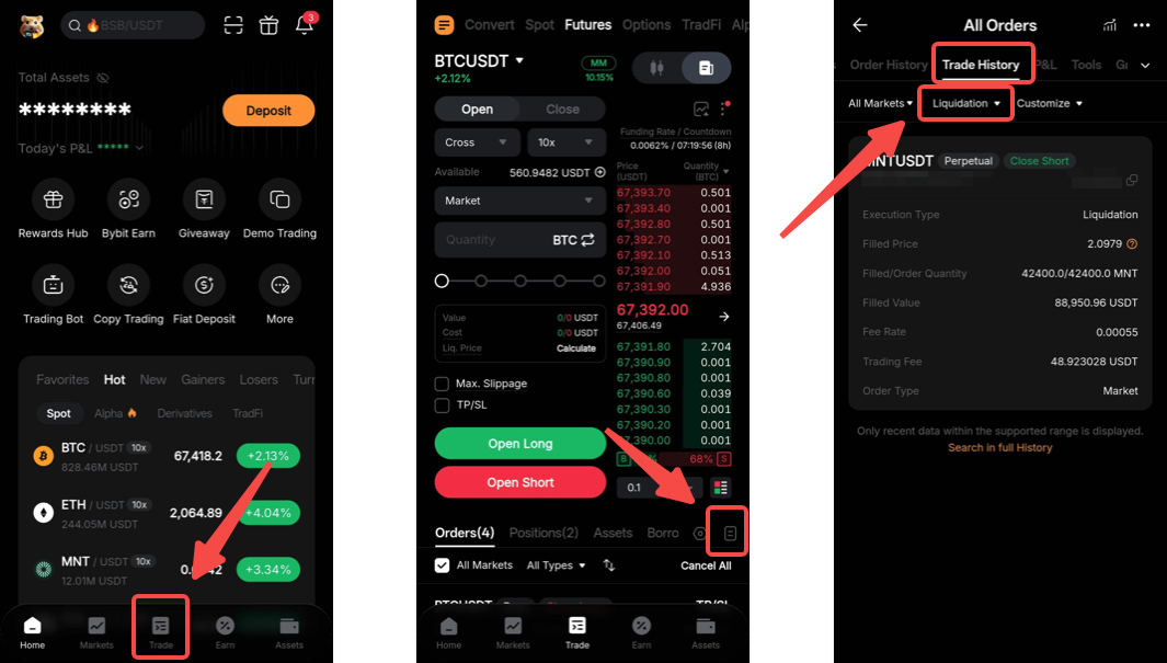在 Bybit App,前往底部菜单中的交易栏目,然后点击订单簿右下角的历史记录图标。切换至交易历史栏目,并在成交类型篩選中选择强制平仓。