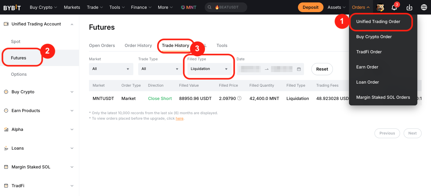 在网站上,前往导航栏上方的订单,然后选择统一交易订单。在左侧面板中,点击交割,然后打开交易历史选项卡,并从成交类型筛选器中选择强制平仓。