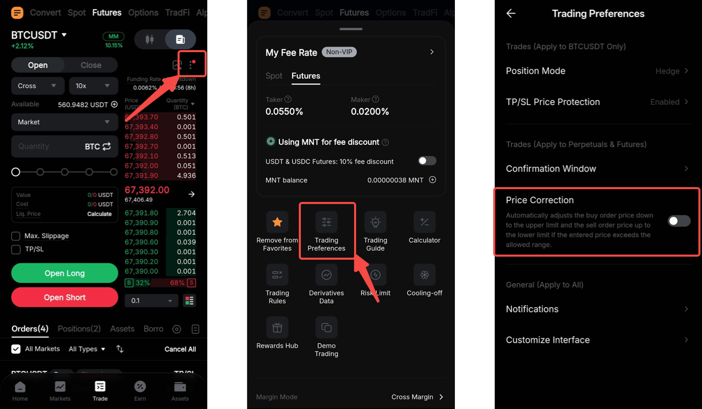 在 Bybit App 上,前往交易页面,点击订单簿右上角的省略号图标,然后选择交易偏好设置。接着,找到价格纠偏并将其开启。