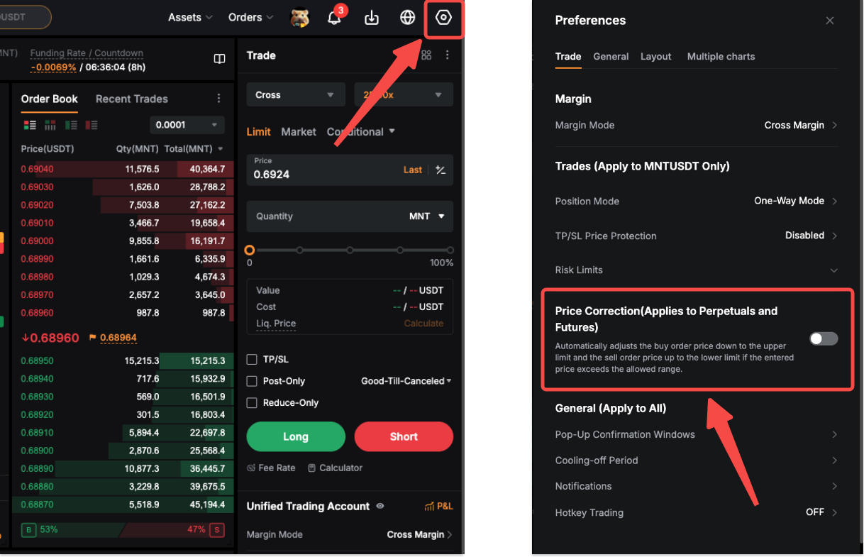 在网站上,前往 交易页面,并点击右上角的 设置 图标以访问 偏好设置。在 交易 选项卡下,找到 价格修正 并将其开启。