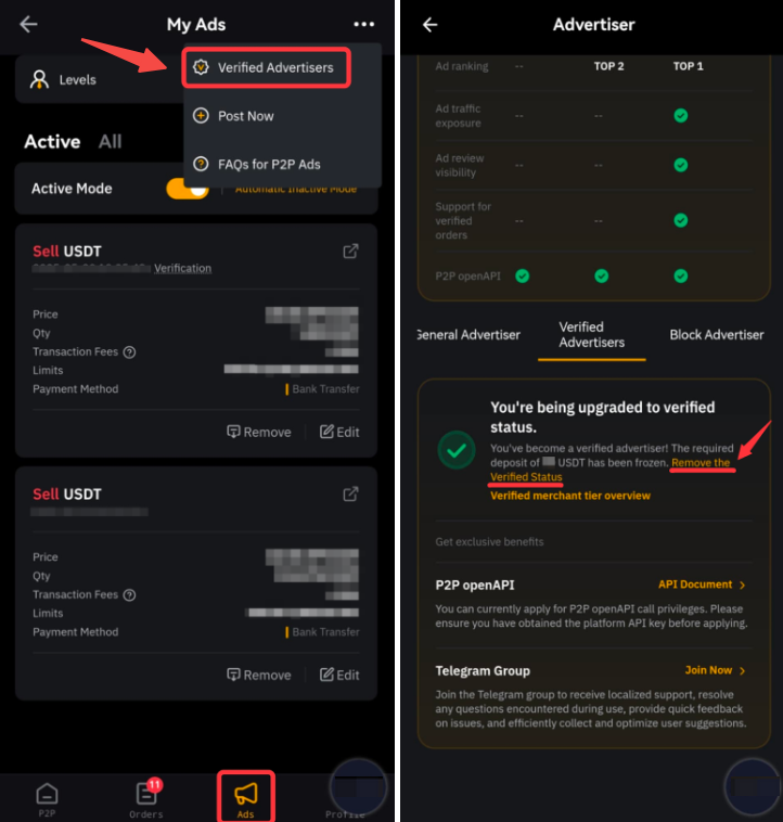 在网站上,只需前往 买币 → P2P 交易 → 广告 → 广告方特权,然后点击删除认证状态。