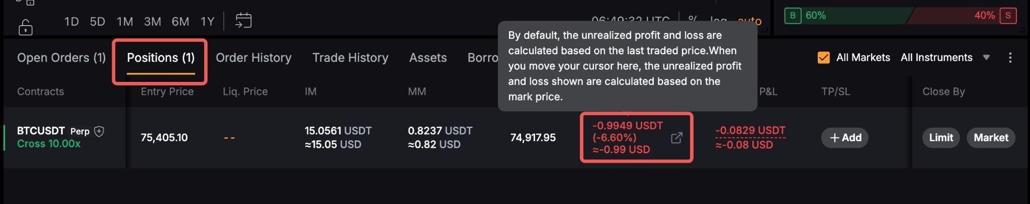 默认情况下,未结盈亏 是基于最新成交价 (LTP) 计算的。您可以将鼠标悬停在未结盈亏字段上,以查看使用标记价格计算的值,该价格是系统用于强制平仓的公允价格参考。