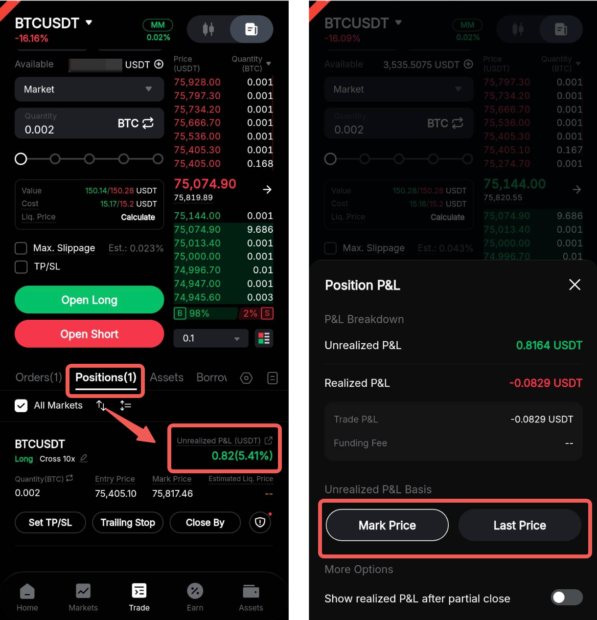 如果您的盈亏当前在 App 中是基于标记价格显示的,请点击仓位部分的未结盈亏区域。这可能会切换显示基准或打开设置菜单,您可以在其中重新选择 LTP。